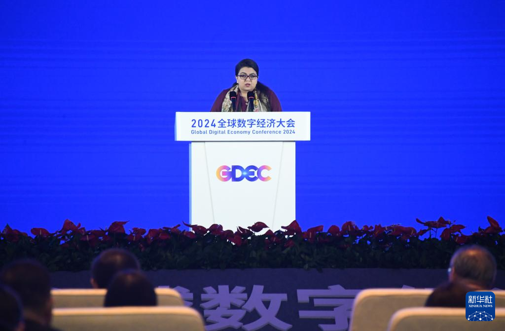 7月2日,巴基斯坦信息技术和通信部部长莎萨·法蒂玛·赫瓦贾在2024全球数字经济大会开幕式上致辞。