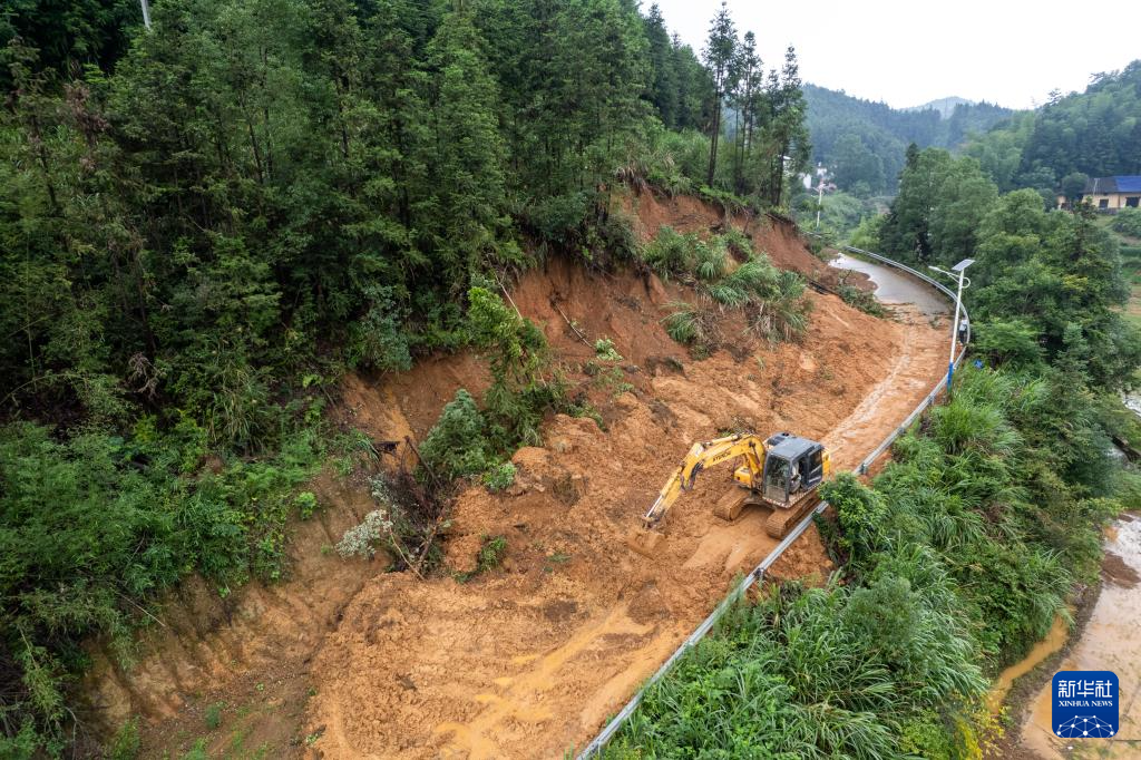 7月2日,挖机在平江县三市镇疏通道路(无人机照片)。