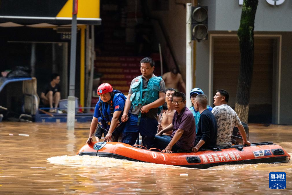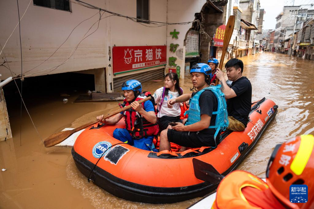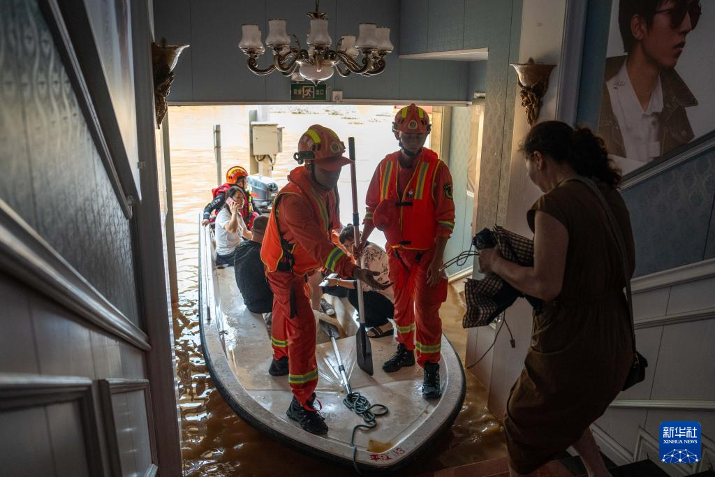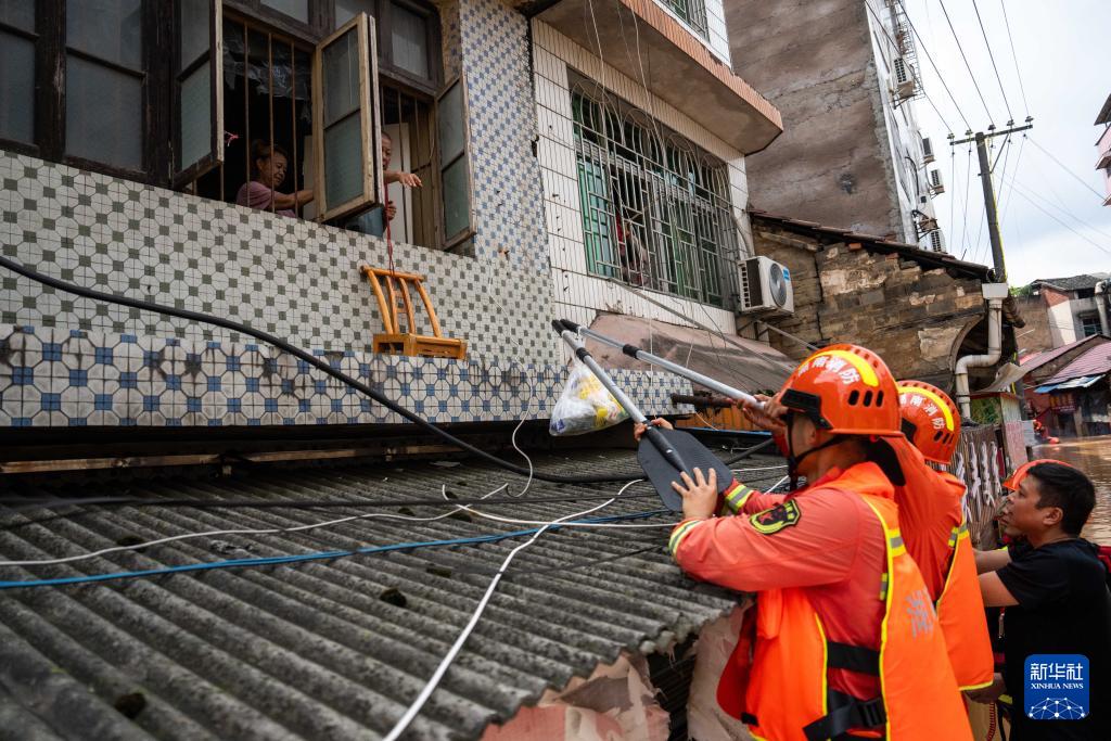 7月2日,在平江县大桥西路附近,消防员在转移群众。