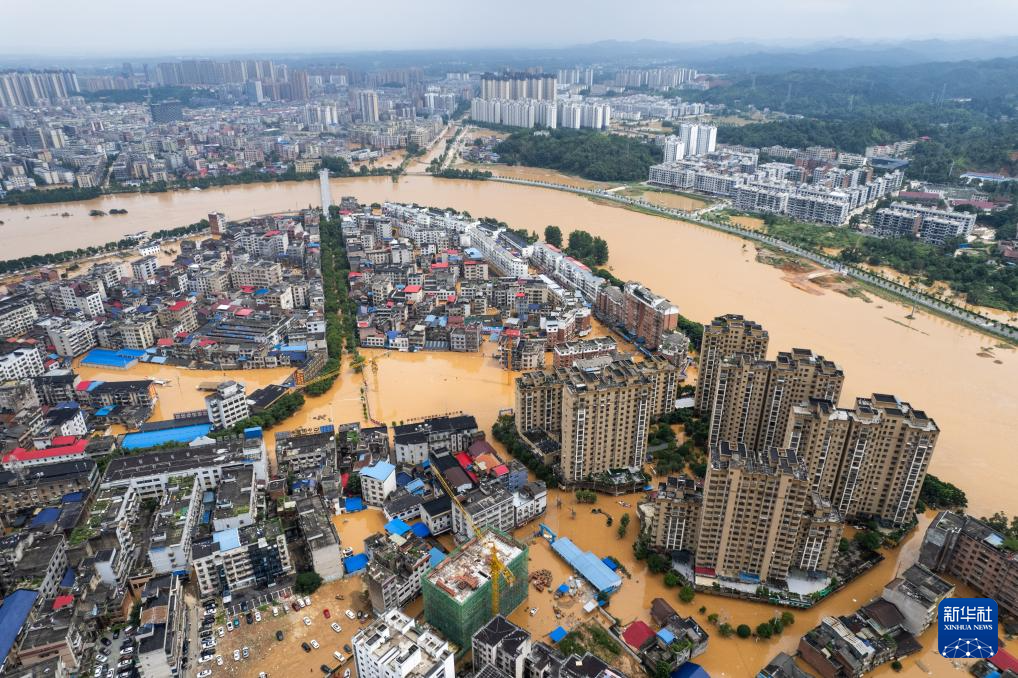 这是7月2日在湖南省岳阳市平江县县城拍摄的内涝现场(无人机照片)。