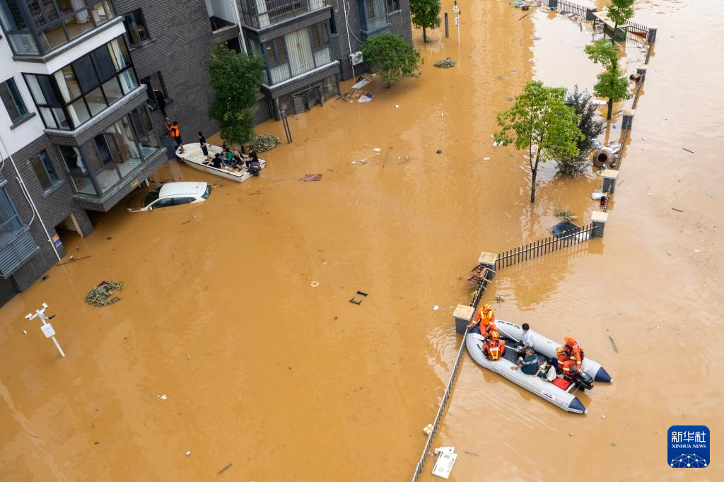7月2日,在平江县大桥西路附近,消防员在转移群众(无人机照片)。