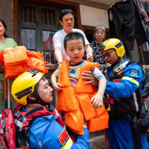 7月2日,在平江县大桥西路附近,蓝天救援队队员在转移群众。
