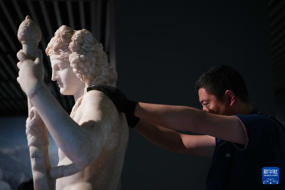7月2日,工作人员将开箱后的古希腊文物放置在展台上。