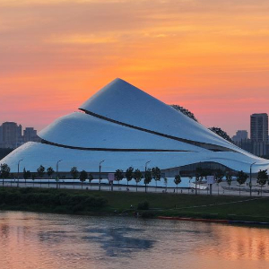 7月2日,晚霞中的哈尔滨大剧院广场。