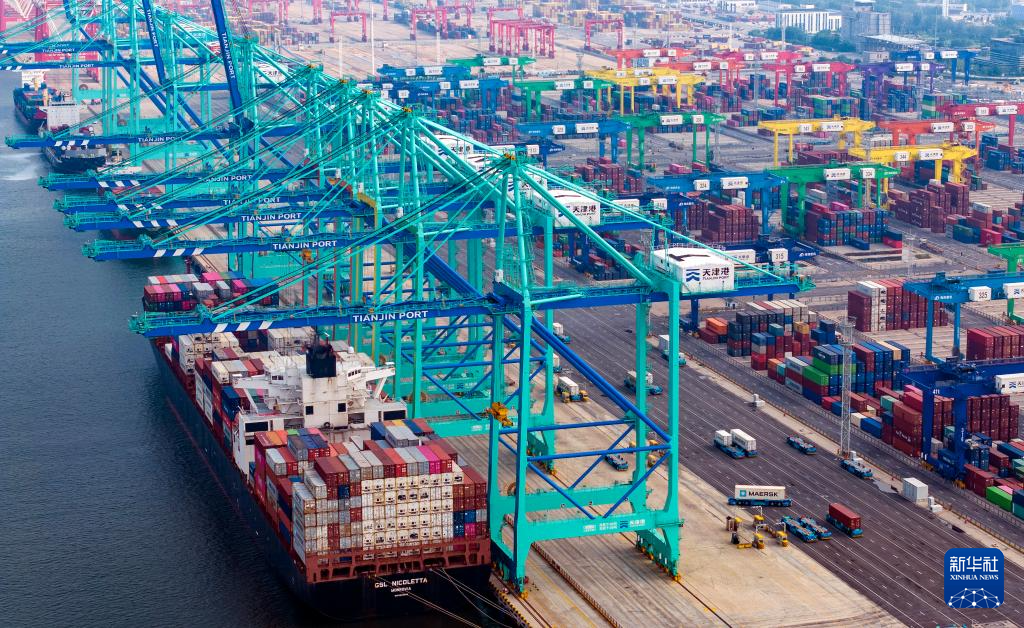 7月3日,一艘集装箱货轮停靠在天津港太平洋国际集装箱码头(无人机照片)。
