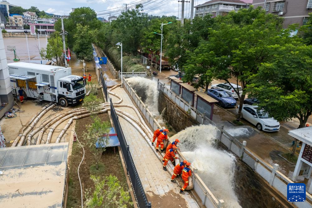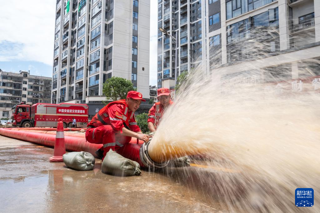 7月3日,在平江县金财花园小区,中国安能武汉救援基地应急保障分队队员在进行排涝工作。