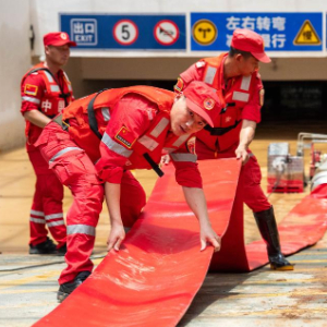 7月3日,在平江县金财花园小区,中国安能武汉救援基地应急保障分队队员在地下车库进行排涝工作。