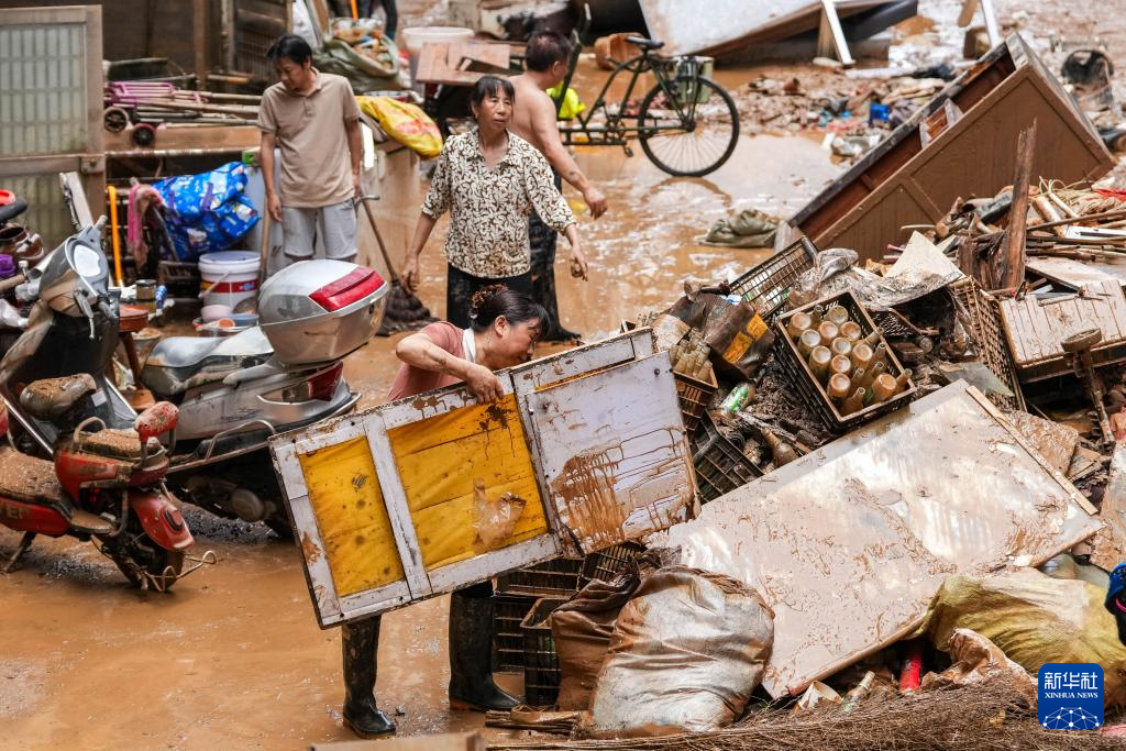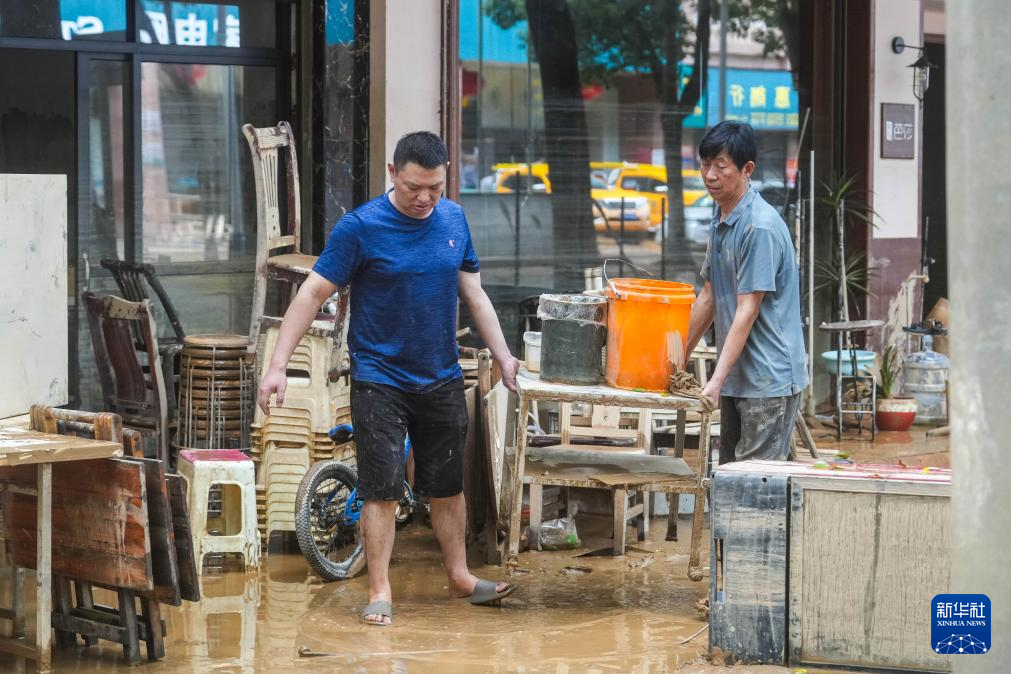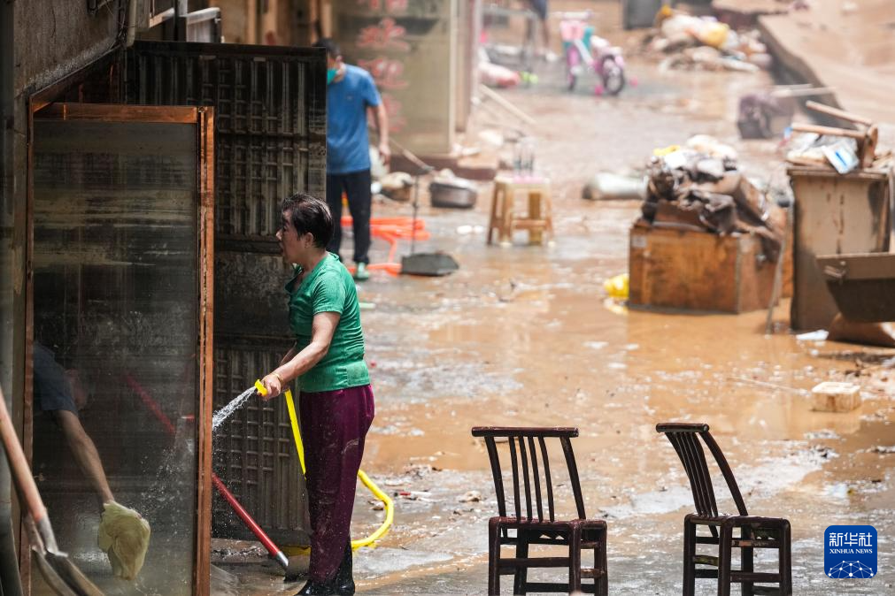 7月3日,在平江县新村路附近,群众在清扫房屋。