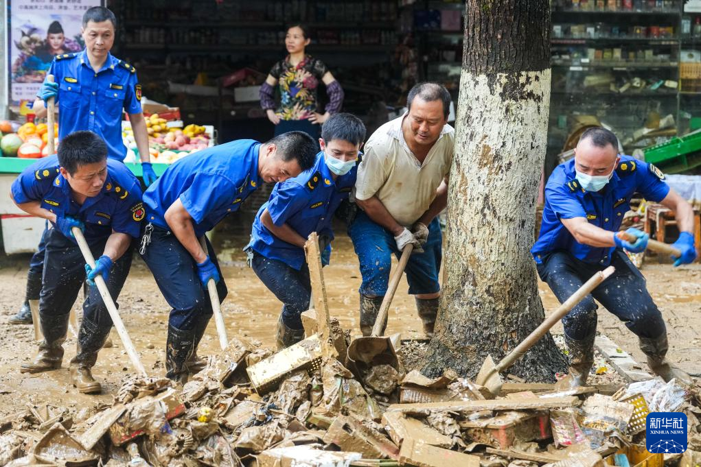 7月3日,在平江县商北街,城管队员和群众一起清理垃圾。