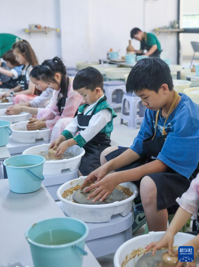 7月3日,在慈溪市匡堰镇上林湖青瓷文化传承园的暑期青瓷文化课堂上,小学生在工作人员的带领下体验青瓷拉坯。