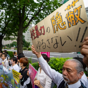 7月2日,在日本东京,民众聚集在日本外务省外,抗议日本政府隐瞒冲绳美军性侵消息。