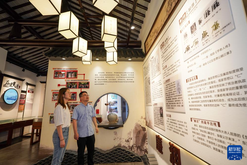7月4日,参观者在苏州市吴江区平望镇廉洁教育基地莺湖廉园内参观。