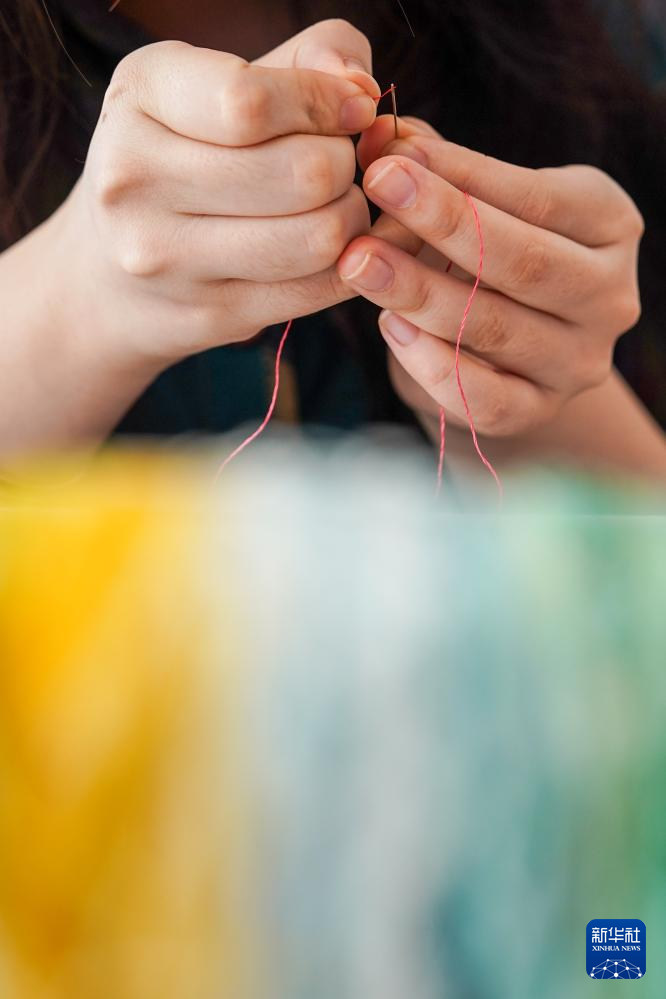 7月3日,在苏州高新区苏绣小镇的一家苏绣公司,一名绣娘在穿针,准备加工苏绣产品。