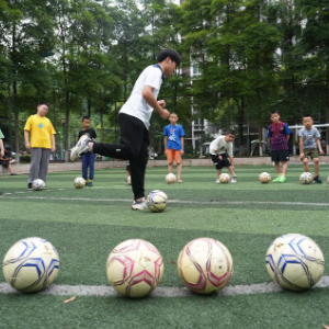 7月4日,在重庆市北碚区水土街道和悦家园社区,小朋友在大学生志愿者指导下练习踢足球。