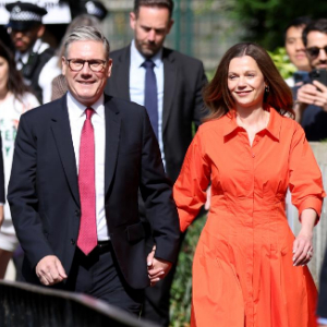 7月4日,在英国伦敦,英国工党领袖基尔·斯塔默(前左)与妻子前往一处投票站,准备投票。