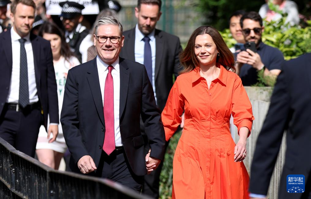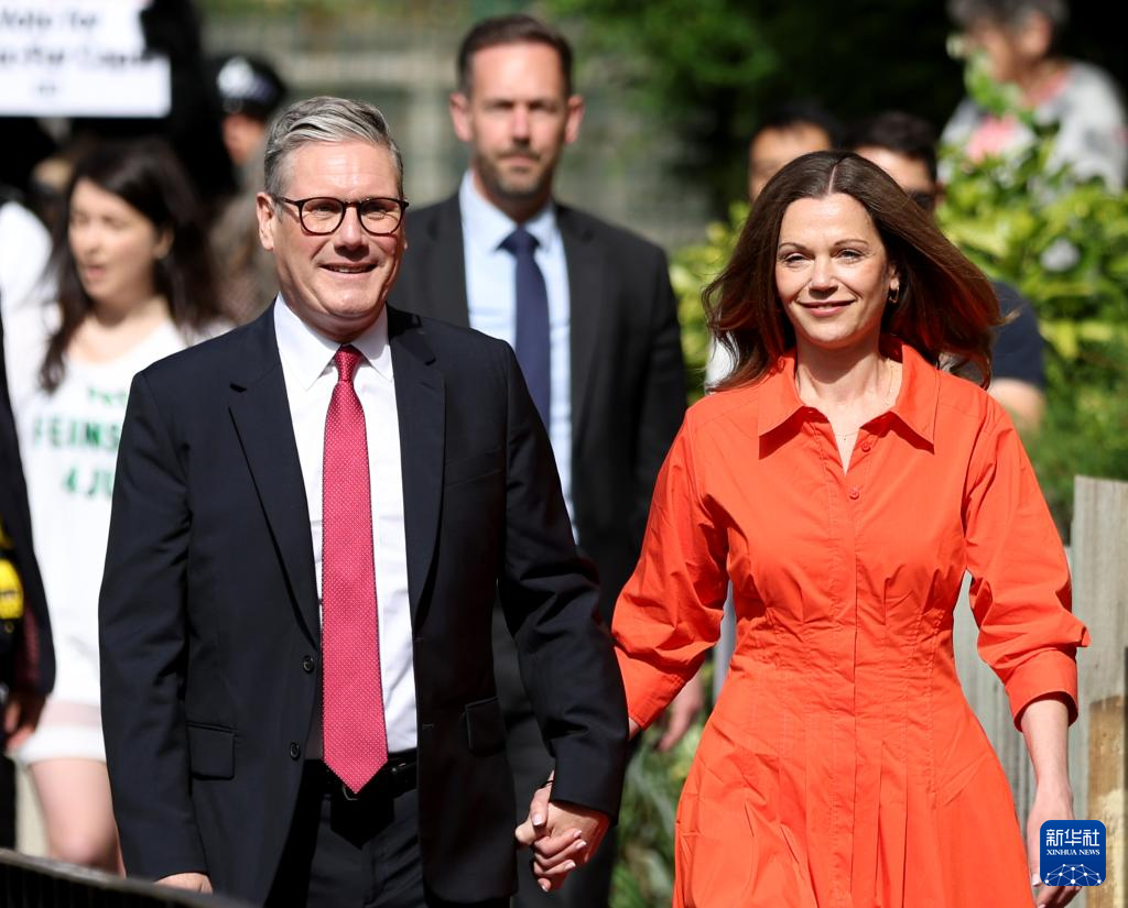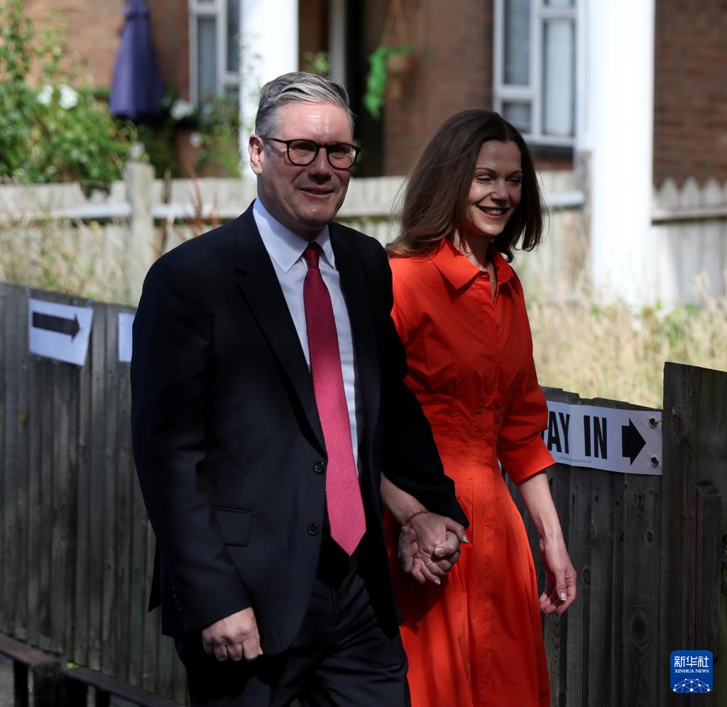 7月4日,在英国伦敦,英国工党领袖基尔·斯塔默与妻子前往一处投票站,准备投票。