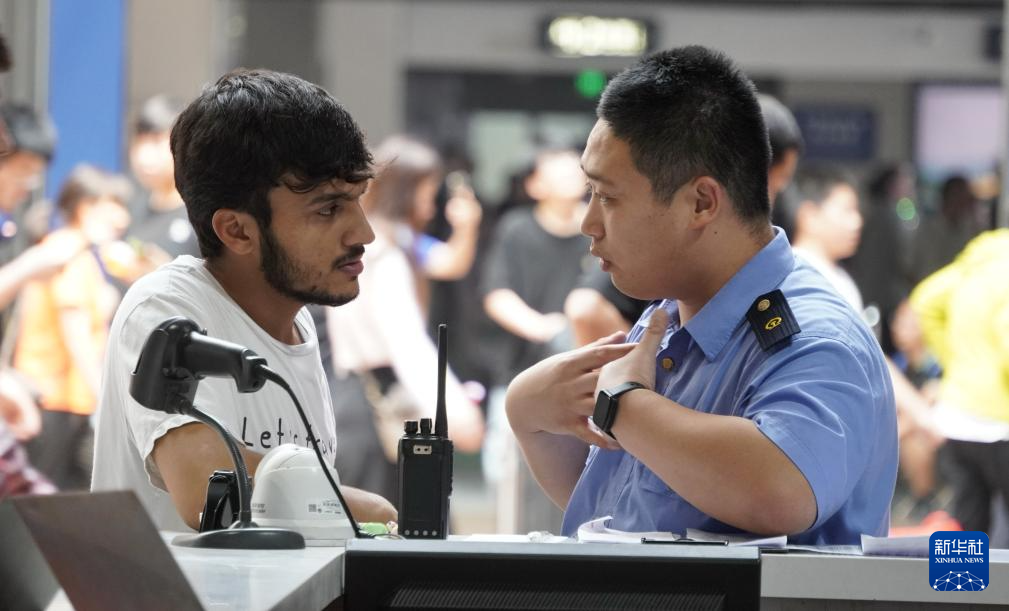 7月4日,北京西站工作人员为外籍旅客提供出行咨询。
