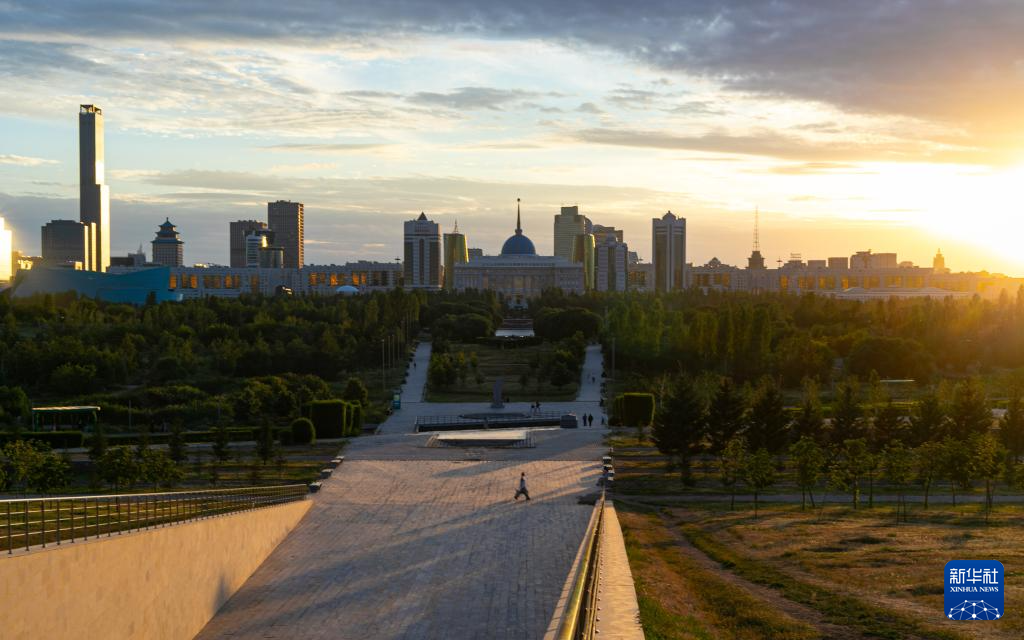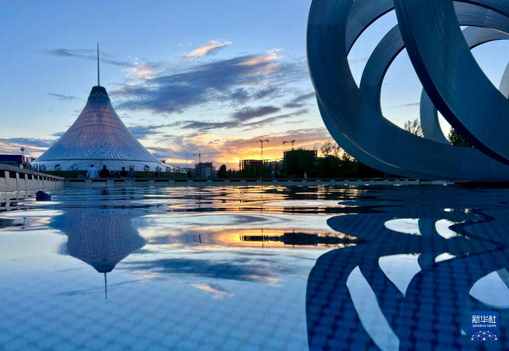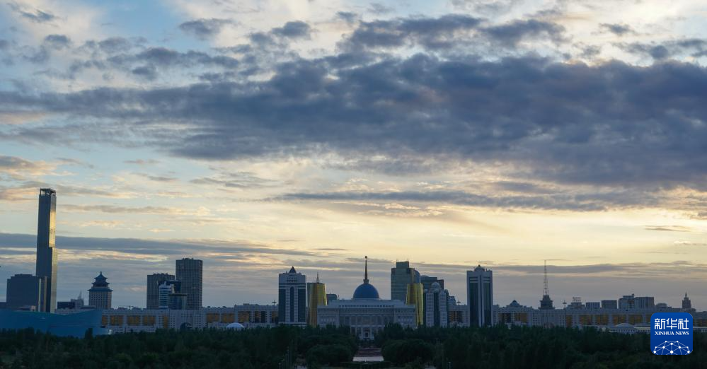 这是7月2日拍摄的哈萨克斯坦首都阿斯塔纳日落时分的天际线。