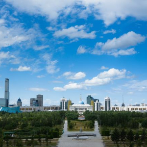 在蓝天白云的映衬下,阿斯塔纳颇具特色的建筑群勾勒出美丽的天际线。