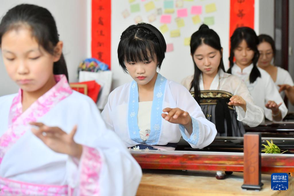 7月4日,在河南省夏邑县非遗古琴传习所,孩子们练习弹奏古琴。