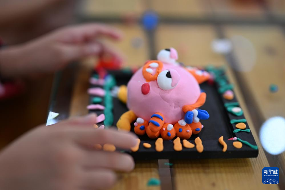 7月4日,在浙江省台州市黄岩区北城街道新时代文明实践所,一名小朋友制作出一个创意黏土手工“情绪小怪兽”。