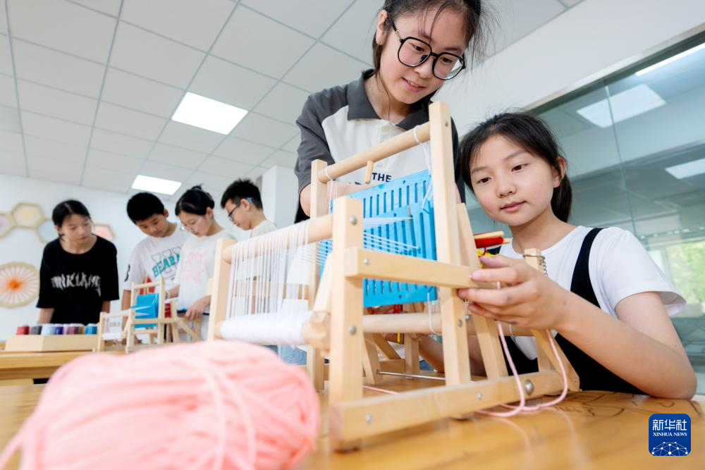 7月2日,在浙江省湖州市长兴县夹浦镇成人文化技术学校,暑托班孩子体验传统织布。