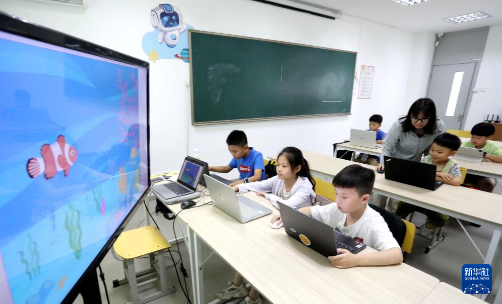7月2日,在江苏省苏州市姑苏区青少年宫,孩子在学习电脑编程制作动画游戏。