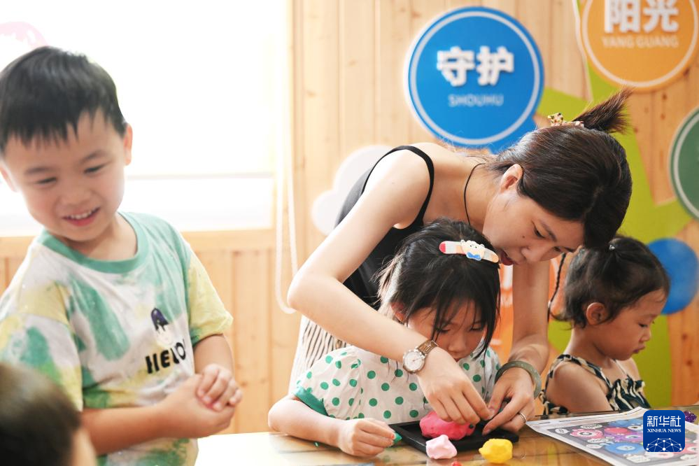 7月4日,在浙江省台州市黄岩区北城街道新时代文明实践所,老师教小朋友制作创意黏土手工。