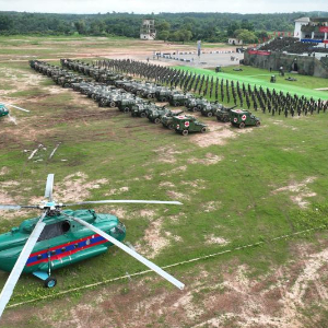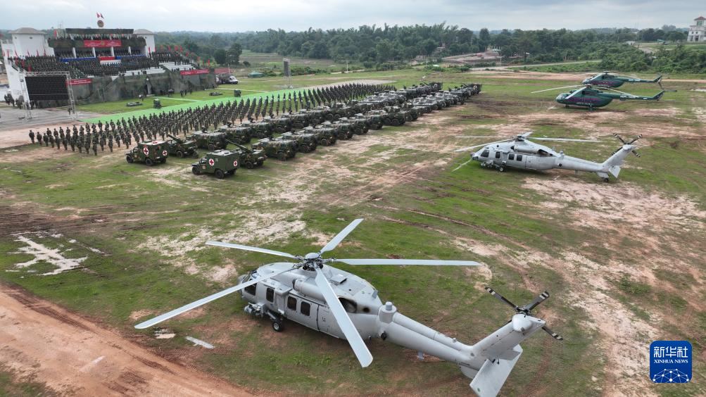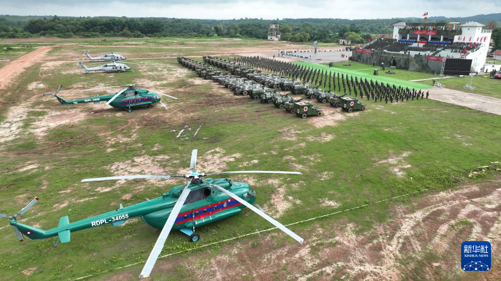 这是7月5日在老挝人民军库玛丹学院训练场拍摄的中老“友谊盾牌-2024”联合演习开始仪式现场(无人机照片)。