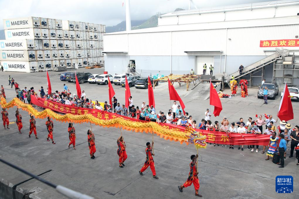 这是7月5日在塞舌尔维多利亚新港码头拍摄的欢迎仪式。