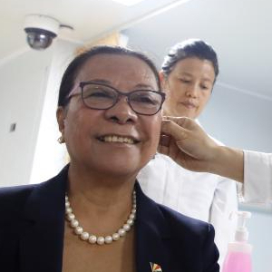 7月5日,塞舌尔卫生部长维多在中国海军“和平方舟”号医院船上体验中医。