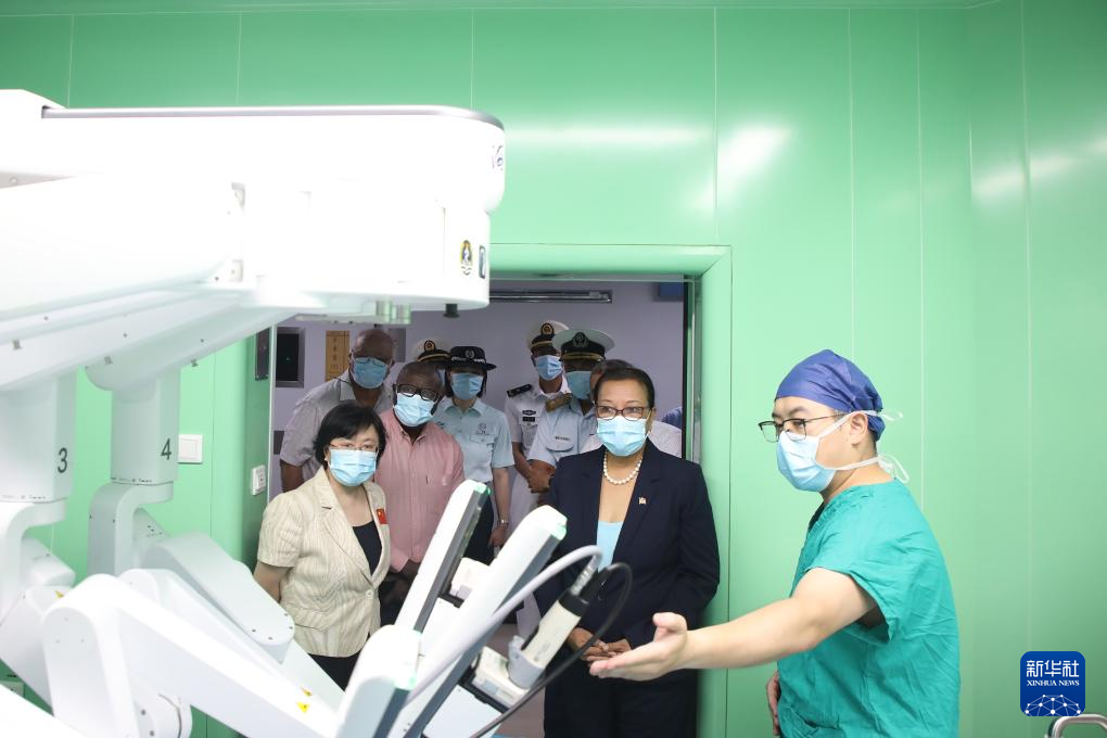 7月5日,塞舌尔卫生部长维多在中国海军“和平方舟”号医院船上参观。