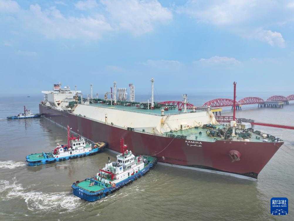 7月5日,来自卡塔尔的LNG船舶“阿米拉”靠泊江苏如东洋口港LNG码头(无人机照片)。