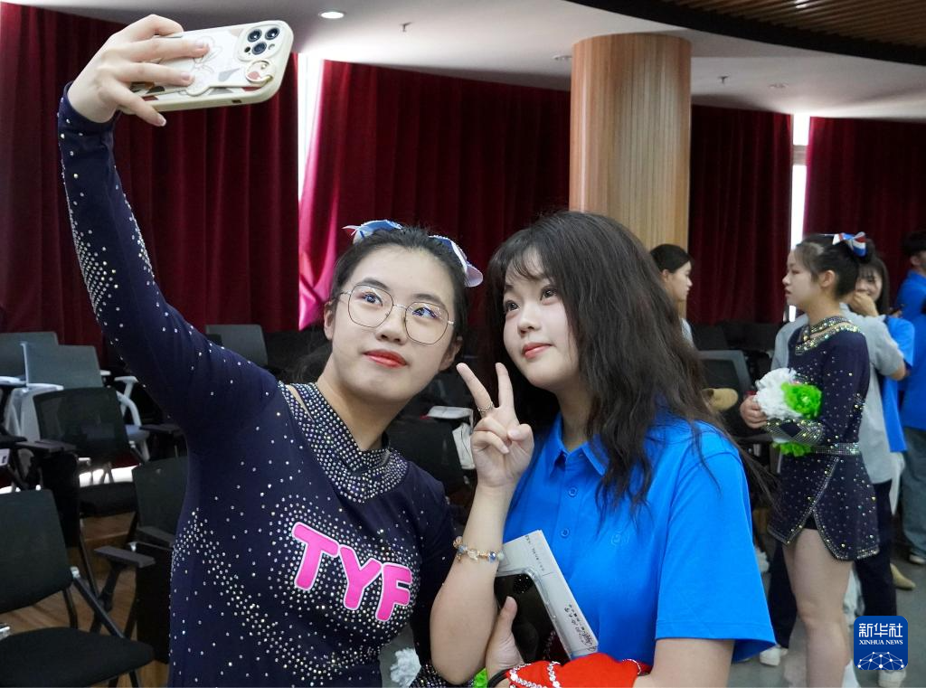 7月5日,同济大学第一附属中学学生吴婧瑶(左)与桃园市私立新兴高中学生徐采杏在交流活动时合影留念。
