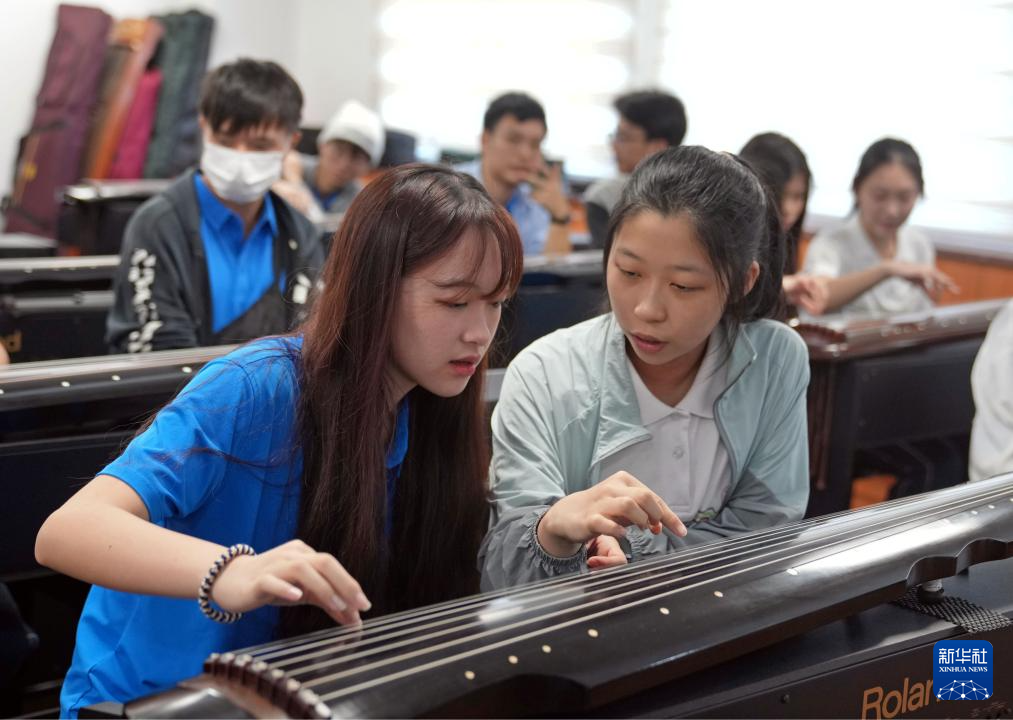 7月5日,在上海市光明中学,新北市板桥高级中学学生林亦珍(前左)与光明中学学生庄琰隽结对,体验古琴弹奏。