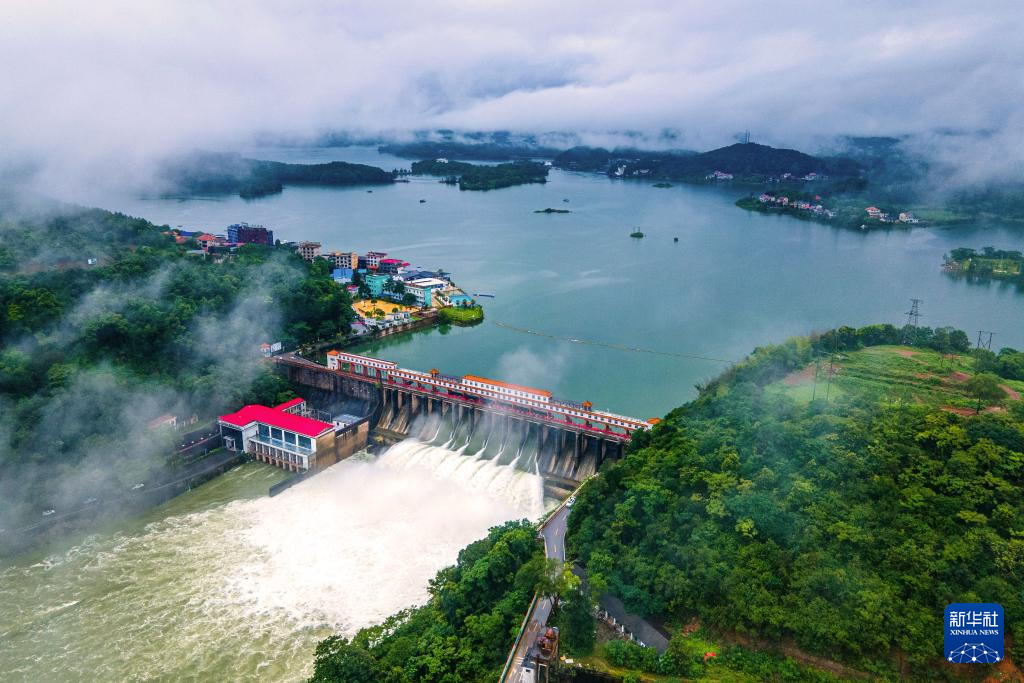 6月30日,在湖南省娄底市双峰县杏子铺镇,湖南水府庙水库开启闸门泄洪(无人机照片)。