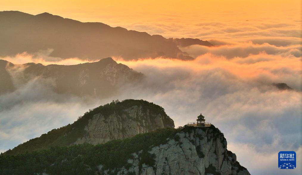 7月3日清晨,雨后初晴的河北省石家庄市灵寿县五岳寨国家森林公园形成壮观的云海景观(无人机照片)。