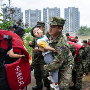 7月1日,在湖南省平江县天岳街道大西村,民兵在转移群众。