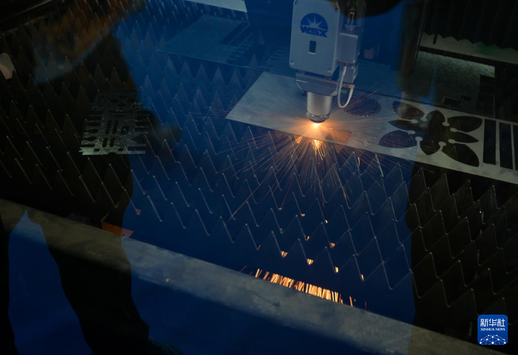 6月28日,在第八届中国—亚欧博览会上,大鹏激光展台工作人员展示操作激光切割机。