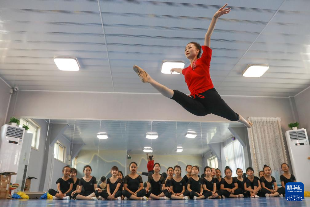 7月3日,在河南省宝丰县一家舞蹈培训机构,老师为小朋友展示舞蹈动作。