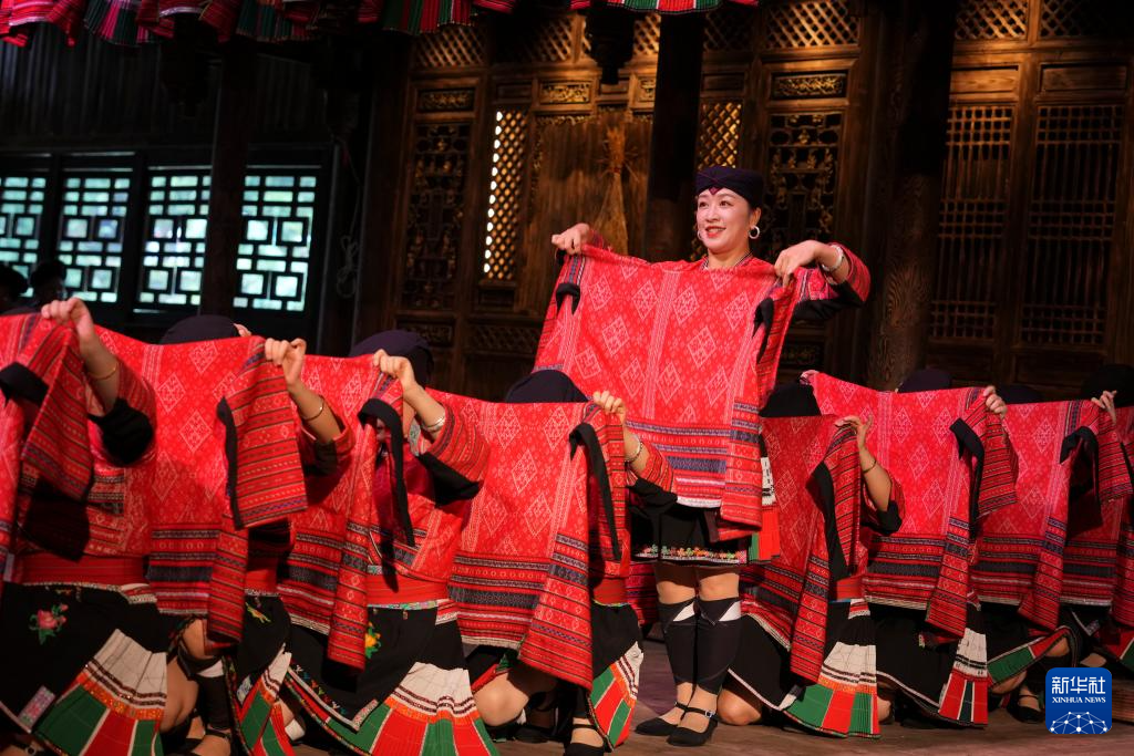 在黄洛瑶寨,村民潘凤飞在红瑶民俗文化表演中展示瑶族服饰(6月26日摄)。