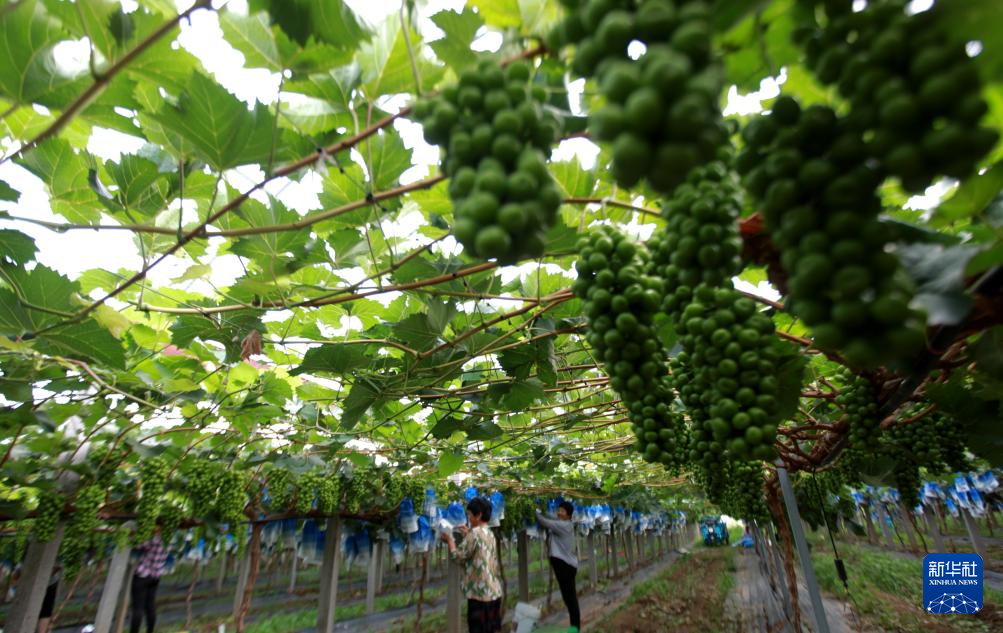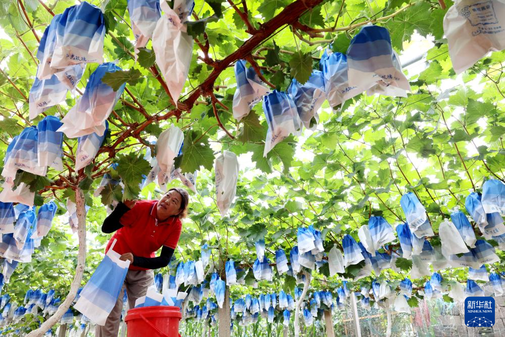7月6日,在山东省临沂市平邑县地方镇东家庄村,村民在管护晚熟葡萄。