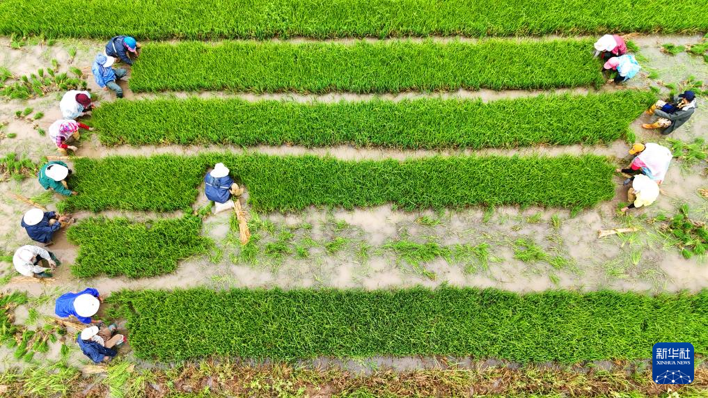 7月6日,在江苏省连云港市农业科学院试验基地,工人起获水稻秧苗准备插秧(无人机照片)。