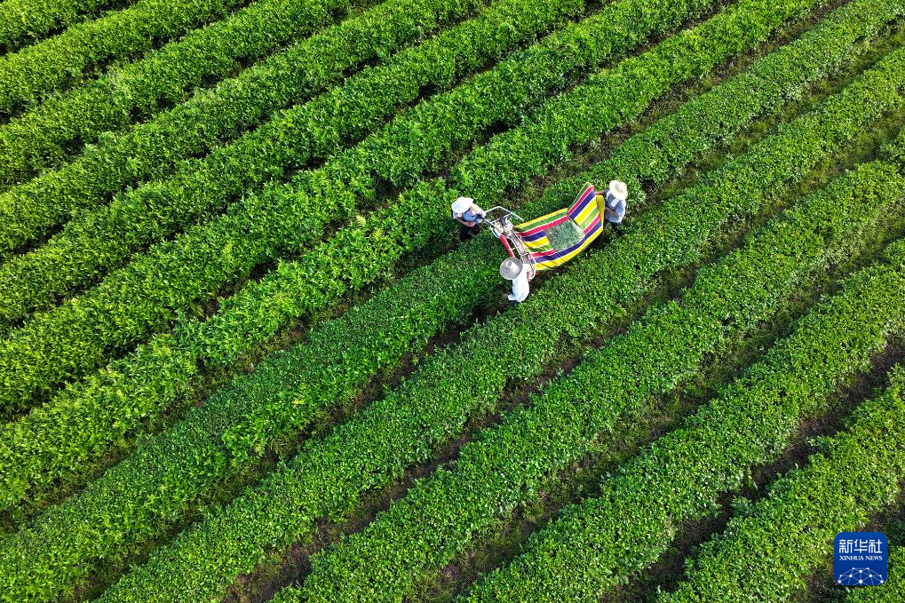 7月6日,在湖北省咸宁市通城县沙堆镇一处茶园,茶农用机械采茶(无人机照片)。