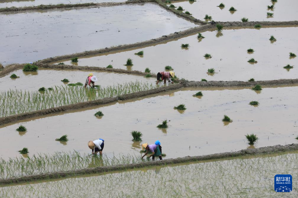 7月6日,在云南省腾冲市荷花镇,村民在移栽水稻。