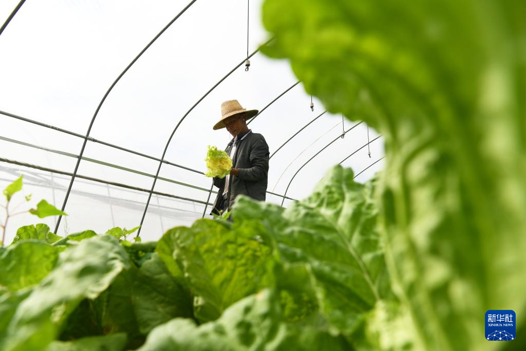 7月6日,菜农在云南省丽江市古城区金山街道的大棚里采收蔬菜。