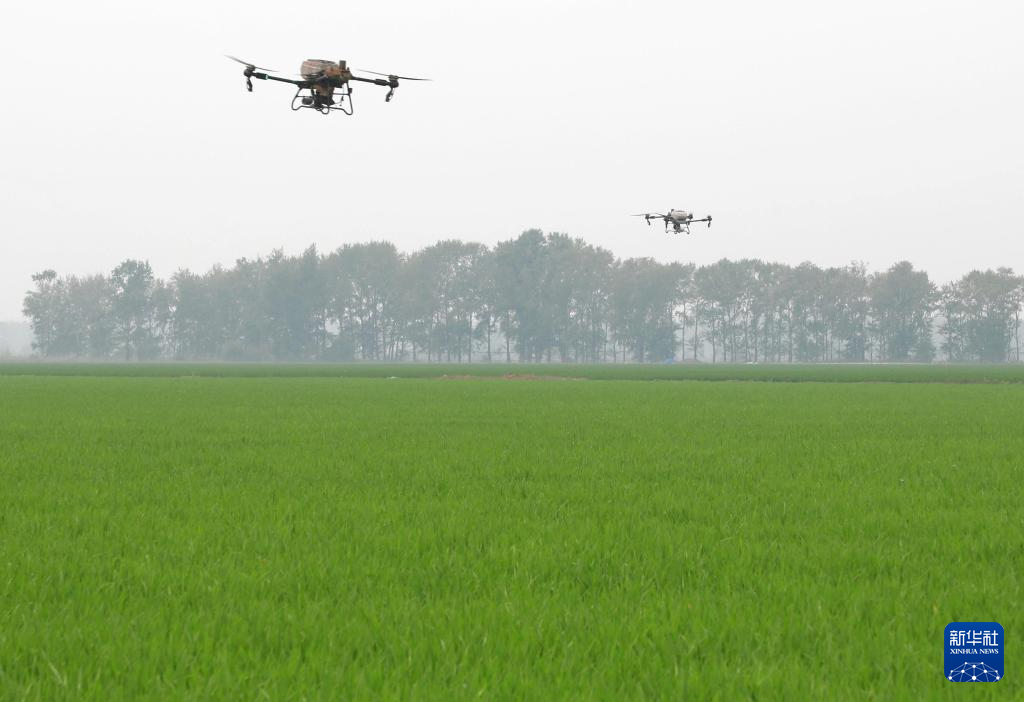 7月6日,在黑龙江垦区的北大荒集团七星农场有限公司第一管理区,无人机在进行水稻追肥作业。
