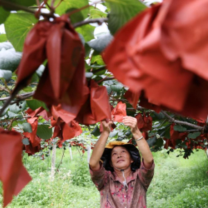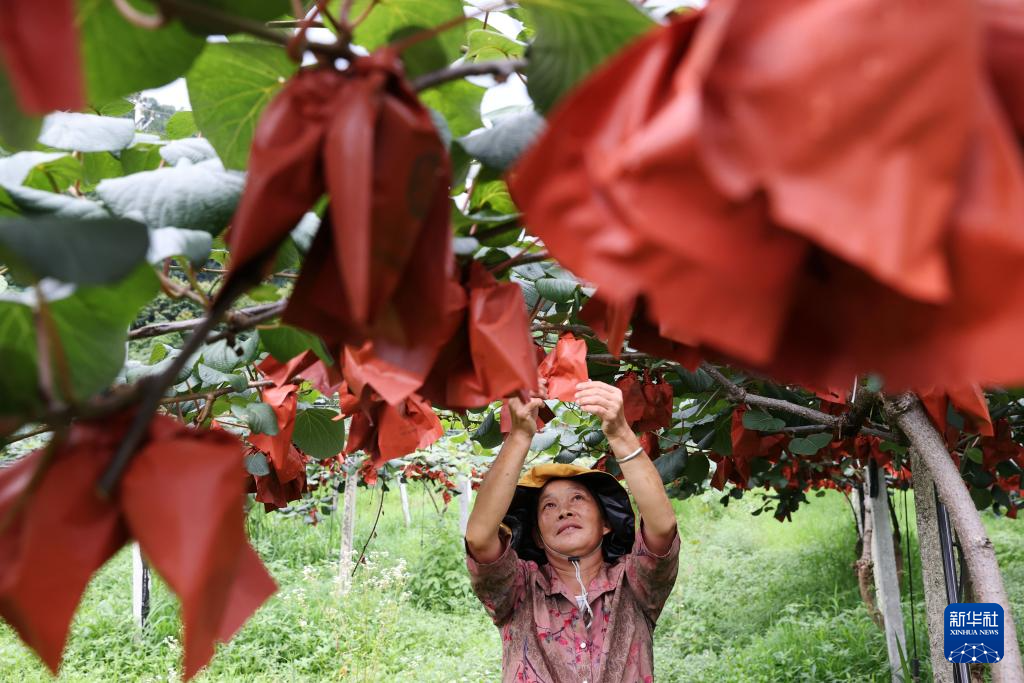 7月6日,重庆市黔江区中塘镇兴泉村村民在猕猴桃基地给猕猴桃套袋。