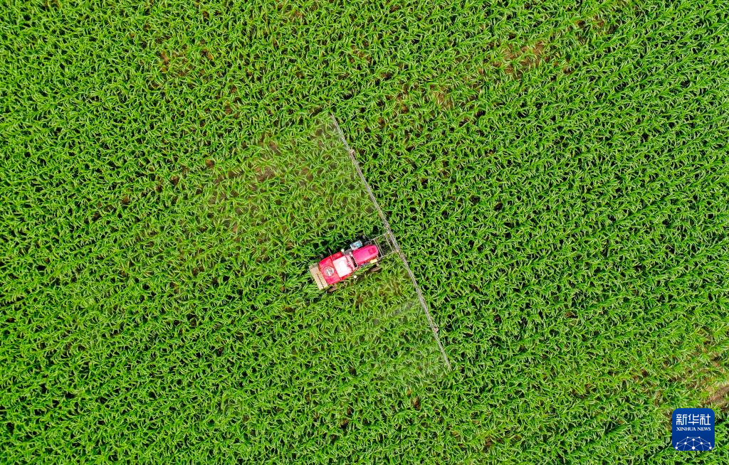 7月6日,在黑龙江垦区的北大荒集团红兴隆分公司友谊农场,大型机车在玉米地块进行夏管作业(无人机照片)。