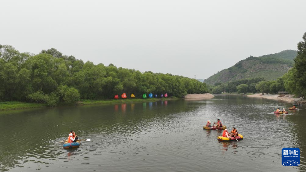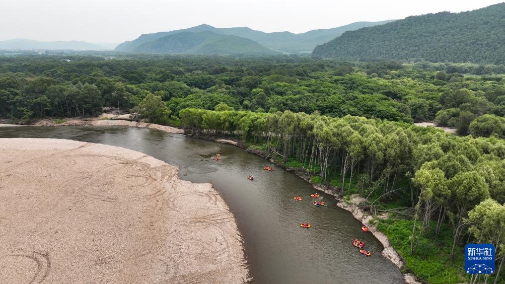 7月6日,游客在流经内蒙古呼伦贝尔市扎兰屯市南木鄂伦春民族乡的雅鲁河上体验漂流(无人机照片)。